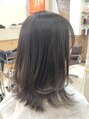 ミディアムボブの長めレイヤー。顎下ラインのレイヤーでくびれを作り、ふんわりアレンジしやすく。適度な毛量調整で時短ドライに。7トーン・アッシュグレーカラーで赤みを抑えた落ち着きのある仕上がりに。