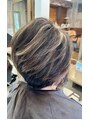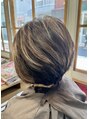 ショートボブにしてみました!表面にはメッシュを入れて根元は白髪染めをしてます!少し癖のある髪質のお客様。ブローしないでなるべく作れるスタイルにしてみました。