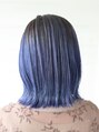 バレイヤージュにネイビーブルーをオン。切りっぱなし感のある外ハネスタイル。ネイビーブルーが退色すると、きれいなシルバーになる2ウェイカラーです。