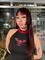 ブリーチありのベリーレッドダブルカラーで出せる深みのある赤です前下がりの姫カットとV字バングがカッコいい雰囲気をより作ります。
