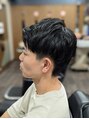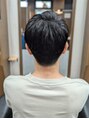 アップバングショートサイドはツーブロック、襟足はすっきり刈り上げスタイリングで前髪を上げやすいように長さを調整しジェルやワックスで仕上げます。