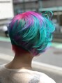 グリーンピンクレッド3色で作るアシメショート!左から見ればマッシュ右から見れば前下がりショートチラ見えする赤い刈り上げがポイントになります!