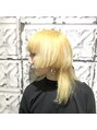 ブリーチのみの金髪。根元はブリーチ1回。中間から毛先にかけては3回以上です。