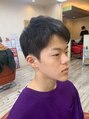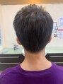 サイドとバックは厚く刈上げて、シルエットを丸みを出す事を意識しました。トップはセイムレイヤーに設定し、立ちあがりやすく、毛量調整しました。ワックスを付けなくても形になりやすいスタイルです。