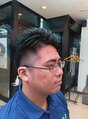 横と後ろをバリカン3ミリを入れてベースを作ってから、ハサミで斜めにするフェードカットに。前髪は、センター部をアップバングにして左サイドを束感を作りながら下ろしています。スタイリング剤は、クックグリースとクールグリースを1対1で混ぜて使用。