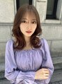 長さは鎖骨と胸の間のセミディヘア。やや薄めの前髪とお顔周りをスッキリと見せるサイドバング、ほんの少し入れたレイヤーを活かすため波巻き仕上げ。カラーは艶のある明るめのオリーブベージュ。