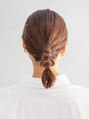簡単&可愛い三つ編みポニーテールアレンジ。2本の三つ編みを1つにまとめることで、こなれ感のあるシルエットに仕上がります。サイドのゴールドピンがアクセントになり、オケージョンシーンにもぴったりの華やかな印象に。