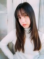 長めバングにレイヤーの入ったロングヘアスタイル。カラーは赤みの少ないブラウンカラーで透明感のあるカラーに。顔周りとサイドにレイヤーを入れることで巻いた時にうごきがでて、長くてのっぺりしがちなロングも動きのあるスタイルに。【パーマ/韓国/学割】