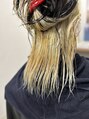 なるべく白っぽくという事で、元々してあったブリーチに一度だけブリーチをすると、写真のように真ん中付近にオレンジ色が残っています。コレは半年ほど前のカラーの残りです。なので、濃いめにグレーと青を入れていきます。