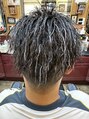髪が多いので毛量調整してからフルツーブロックカットを施術。全体にブリーチでメッシュカラー後、ツイストパーマを施術しました。