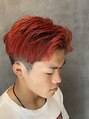 ツーブロックにスッキリ刈り上げて全体的に短めにカットしています。毛量が多いので多めに梳いて毛束を出しやすいカットにしています。カラーは1回ブリーチで綺麗になる赤系カラーで染めさせていただきました!!