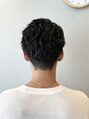 アウトラインは6mm~の刈り上げ。全体に動きの付くパーマをデザイン。ハーフドライでジェルグリースをつけてスタイリングしています。