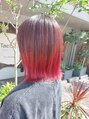 グラデーションカラーです。中間~毛先にかけてを1度ブリーチしてその上からピラミンゴカラーで染めています。落ちてきても黄色ではなくオレンジ系で落ちてきてくれるので色落ちも楽しんで頂けます。カットは外ハネの切りっぱなしボブにしています。