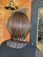 カットは、襟足が長めのウルフショートです。トップはレイヤーーを入れて、後頭部が丸くなるようにました。カラーはブリーチでハイライトを表面に入れてから、全体をアッシュ系カラーをのせました。