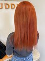 全体ブリーチしてからオレンジベースにレッドを足したカラーで染めています。