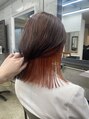 暖色カラーのハイライトとインナーカラーです!ハイライトはピンクベージュカラーでインナーカラーのオレンジカラーと馴染みやすい柔らかいカラーになっています!ブリーチ1回で出来るカラーです!