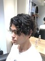 くせ毛を活かしたセンターパートになります。襟足は刈り上げないくらいでスッキリ、顔まわりにかけて前下がりのスタイルです。スタイリング剤はジェルとワックスを混ぜてツヤと動きが出るように仕上げました。