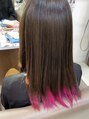 今回はブリーチ1回の幅広めのインナーカラーです!お色はピンク(少し紫よりです)♪ぐるっと幅広めでとっているのでおろしても表面の髪の毛からチラッと見えてきます♪インナーカラーであなただけの個性やお洒落ほいかがでしょうか?!
