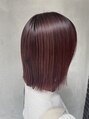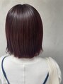 肩上切りっぱなしボブのデザインに、カラーは暖色系のピンクとパープルを入れて艶のあるカラーに仕上げています