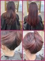 襟足のクセが強い事と、毛量がかなり多い事を考慮しバリカンで刈り上げその上にボブスタイルを作っていましたがこの暑さに耐えかねがっつりショートスタイルに!丁度襟足が伸びていたのでそのまま活かしカラーは女性らしいピンクカラーで仕上げました!
