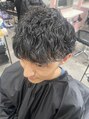 ランダムに縦落ちするように巻いたツイストスパイラルパーマでラフな質感を演出♪カットはサイド2ブロ、後ろも刈り上げてトップは長めに設定してます。