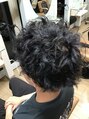 ブリーチしてからブルーブラックを濃いめに入れてあるので、一見黒に見えるが、光の下では味のあるブルーに!スパイラルパーマにちょっとだけツイストも入れてあるので、さらにランダムな動きがでてかっこいいですね!