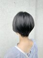 ダークブルーでカラーした襟足すっきりのショートボブ、前髪は長めで大人な雰囲気のスタイルです。