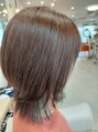 オンカラーはアッシュベージュで、イヤリングカラーはブルー。長さはウルフレイヤーで、束ねられる長さにしています。束ねたりする時に、イヤリングカラーが見えて、アクセントになります。