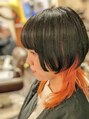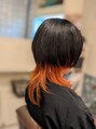 カラーはインナーとのコントラストを生かす為トップをブラック、インナーをオレンジにしました♪カットは顔まわりを重めのマッシュボブにバックは軽めのウルフにしました!個性的なスタイルが彼女にとてもマッチしていました!
