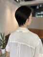 ショートのグラデーションスタイル。毛先の柔らかさがフィット感を演出。後頭部の丸みの位置が少し高い事で、オトナでちょっとクールなムードにしあがっております。