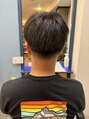 サイドの髪が横にボリュームが出てしまうのでツーブロックにしてスッキリさせました。普段スタイリング剤は使用しないそうなのでトップに高さが出るように毛量調節をしながら前髪は短めにしました。