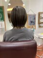 白髪は少しフロントにある感じで、全体にややコントラストを効かせたハイライトを入れて、マットアッシュでクールな印象に。カットはメリハリのあるショートウルフにしました。