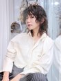 くせ毛風ふわくしゅパーマで個性的なミディアムウルフスタイルに。顔回りのレイヤーカットで小顔。フレンチカジュアルな雰囲気が大人かわいい。耳かけしたり、斜めバングや厚めバングで目力強調もOK。ダークアッシュやグレージュカラーでクールに仕上げて。