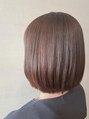 ピンクブラウンのツヤツヤストレート。根元のくせとボリュームは抑えつつ、毛先はまっすぐになりすぎないよう自然な丸みでまとまりやすく。肩につかない長さなのでハネも気になりません。