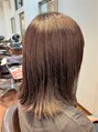 ミディアムの長さに、やや前下がりボブベースに切り、毛先中心に重さを質感毛量調整を施して、軽さと収まりを良くしています。カラーもコバルト系カラーで透明感を出し、超音波トリートメントもして、色持ちとスタイルの持続性を上げています。