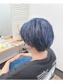 元々残っていたブリーチハイライトをいかして、ブリーチで全体にあげた上に紫よりのブルーをオンカラー