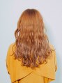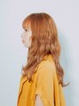 ぱっつんバングにオレンジ系カラーのオルチャン風ヘアです。ハイトーンのオレンジ系カラーにすることでツヤ感がでやすくなります。重ためのカットベースに波ウェーブで仕上げることによりティーンズ・ガーリーな雰囲気をだします。