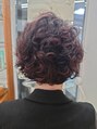 重めなボブからくせ毛を生かしたままセームきみのシルエットなボブへと変身。カラーも全体にハイライトが入ったことにより後から入れた紫寄りな赤がきれいです。