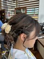 浴衣に会うように少しタイトな編み込みアップサイド裏編みで崩して、毛先はかわいくまとめています。ご持参いただきましたお花の髪飾りがとてもきれいです。
