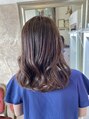 セミロングの長さに表面にレイヤーを入れる事で、動きのある立体感のあるスタイルにに。カラーはベージュ系の明るさで艶感を出しています。