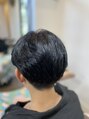 センターパートでニュアンスパーマをかけて流しやすくしています。カラーは少し明るかったのをブルーブラックで落ち着いた大人っぽい雰囲気に仕上げました。セットは艶が出るタイプのスタイリング剤を使っています。
