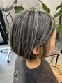 地毛の黒髪と白髪を残したままハイライトのみでカラーリングしています。白髪をデザインの一部にしています。赤みやオレンジになりにくく、大人に似合うグレージュカラーを楽しめます。ハイライト/福岡地毛にハイライト/福岡白髪ぼかし/福岡脱白髪染め