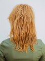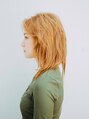 ロブのレングスにハイレイヤーを入れてウルフスタイルに!!カラーは明るめのオレンジベージュでハイライトが入ってます。前髪があるスタイルですが、センターパートでかき上げ風スタイリングをしています。