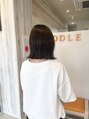 元々の癖を活かすカットをしてくびれミディーに。カラーは色が抜けやすい方なので暗めのアッシュベージュで染めています。