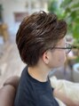 サイドパートでアップバングになるスタイルです。カラーは9トーンのイエローベージュ系で染めてます。セットは艶感の出るクリームタイプのスタイリング剤を使っています。