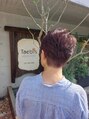耳回りから襟までスッキリと短めにして、もみ上げのみ刈り上げています。ベースはブリーチせずに白髪をいかしてイルミナカラーでムラサキピンク系で染めています。右の方が少し短めのアシンメトリースタイルになっています。