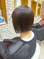 襟足ギリギリの切りっぱなしミニボブです。カラーは、暗めですが、オリーブカラーで透明感を出しています