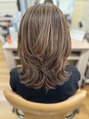 大人のくびれスタイル。トップにボリュームが出て、サイドのラインもひし形にする事でフェイスラインもすっきりさせます。ハイライトで動きの見えるカラーに