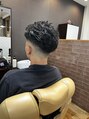 ベーシックなパーマで大人っぽさを出し、刈り上げはスキンフェードにし、さっぱりとした印象のスタイルとなっております。バリカンのミリ数、パーマの強さはお好みで変えられますので、このスタイルにする際は初めのカウンセリングでお申し付けください。