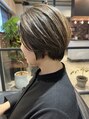 白髪ぼかしで作った透明感カラーに大人に雰囲気の耳掛けショートをかけあわせました。